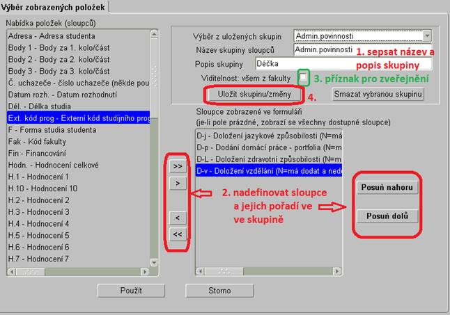 nastavení sloupců je nazváno skupina. Již založené skupiny lze upravovat