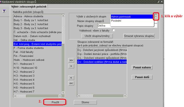 Pod názvem Poslední není stálá skupina, ale ta naposledy použitá. Chcete-li si tedy uchovat nastavení sloupců, které jste používali dosud, doporučujeme uložit si je nejdříve jako skupinu pod jiným názvem dříve, než začnete vytvářet skupiny nové.